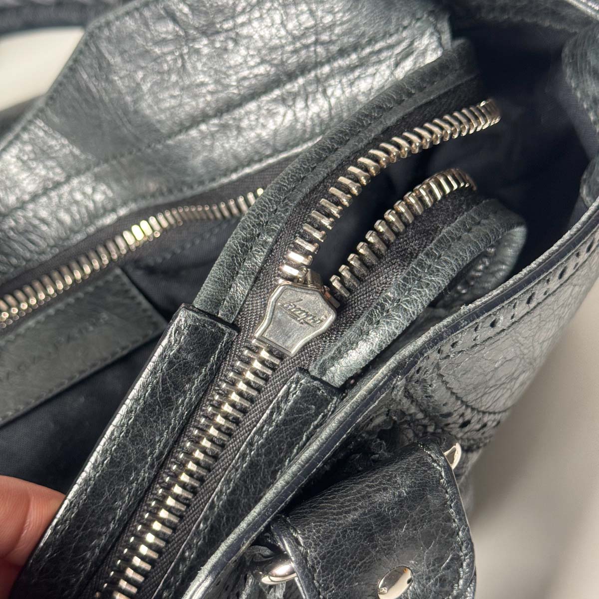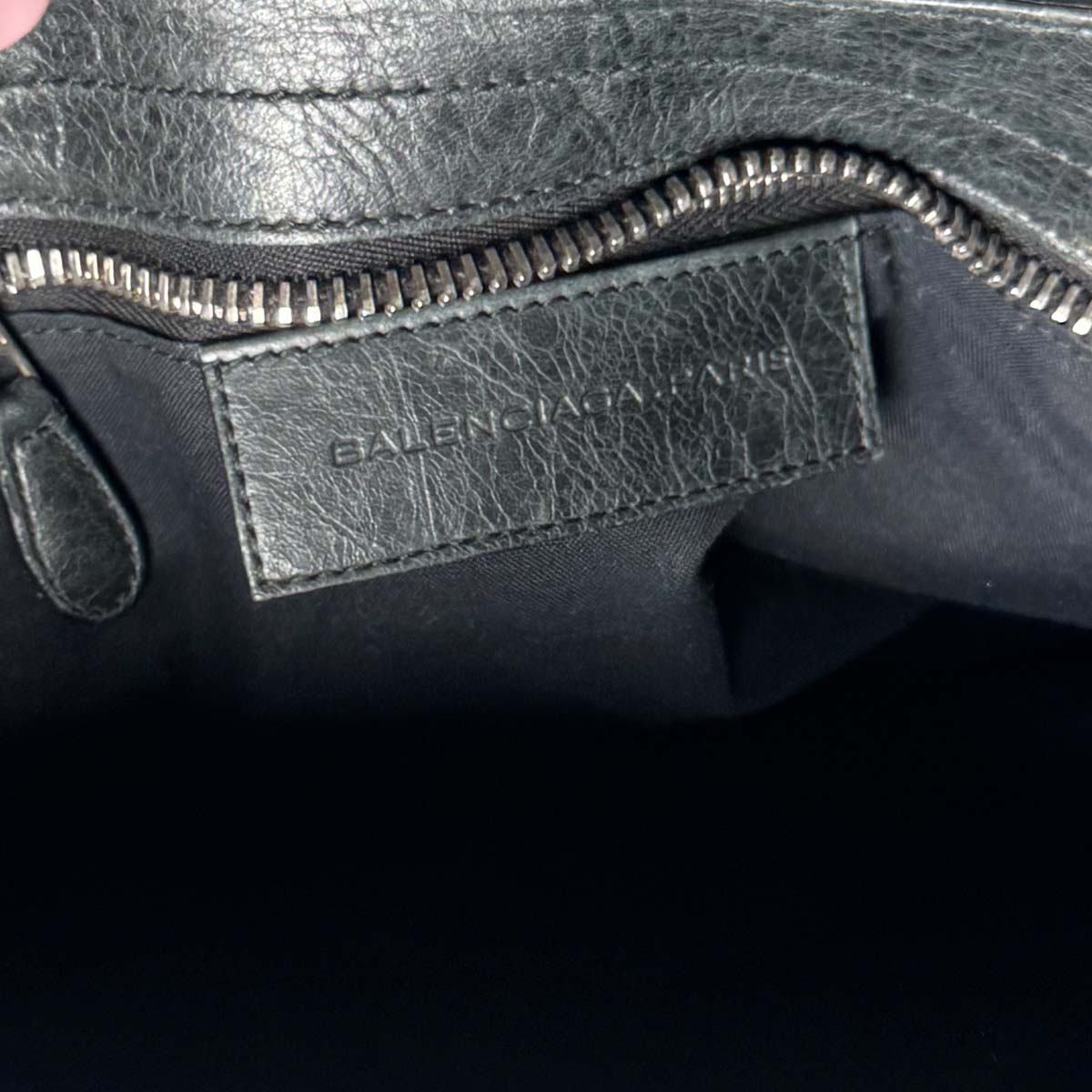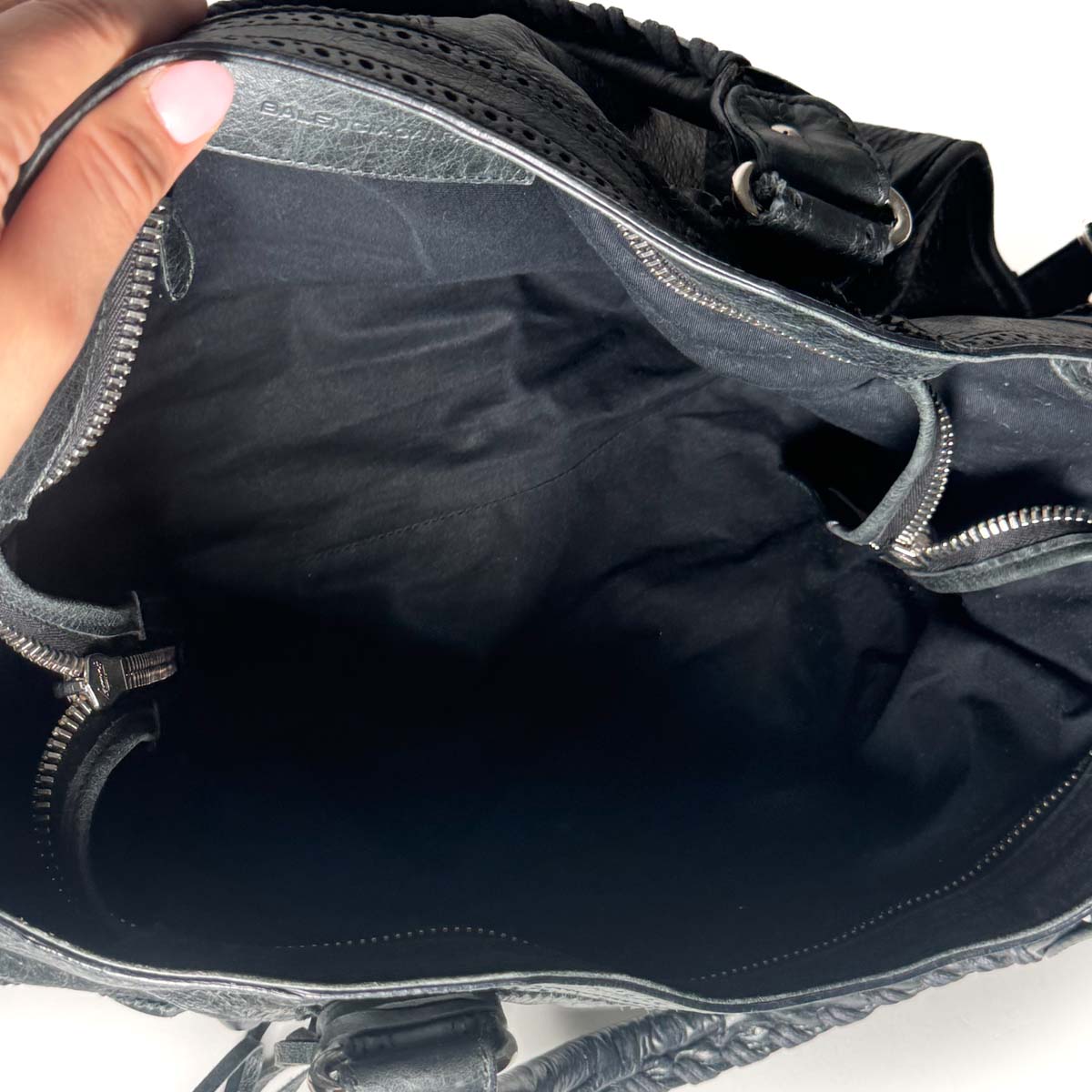 – Black cotton canvas interior with inner zip pocket
