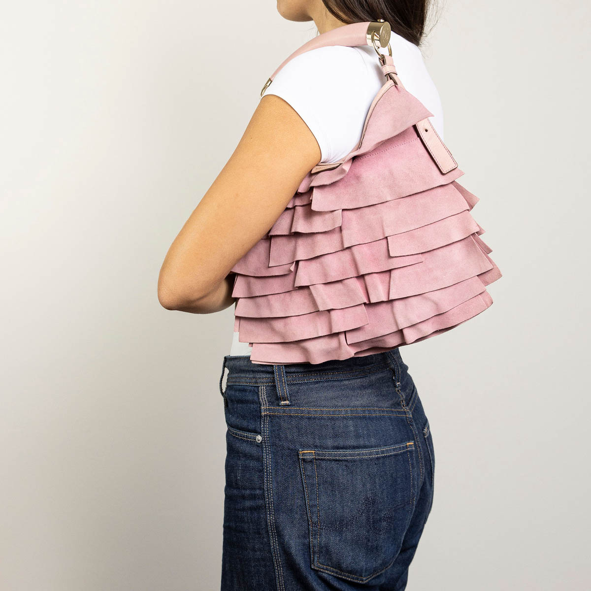 | Condition | Very good condition – The pink suede shows light signs of wear, and has slightly discoloured at the tips of the frills. The smooth leather detailing shows signs of discolouration. The interior suede lining is in excellent condition. |